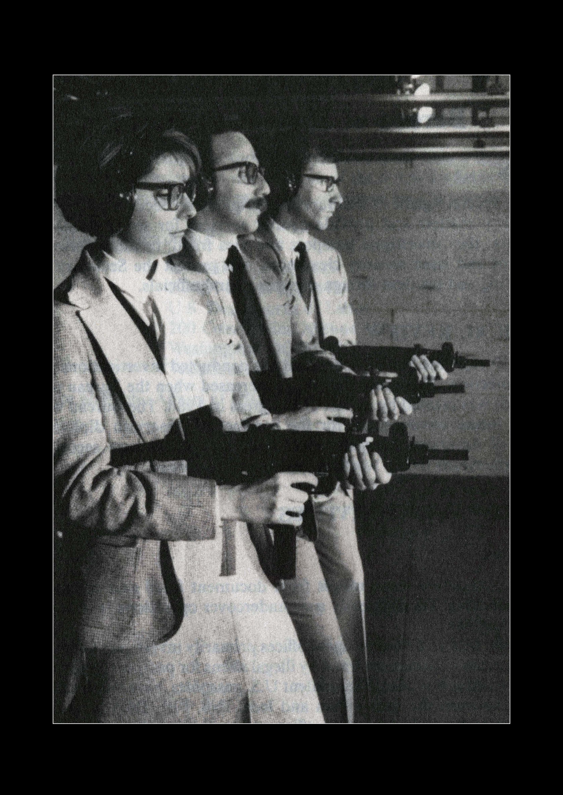 This poster shows agents from the Diplomatic Security Service (DSS) at a shooting range with MP2 submachine guns around 1980.